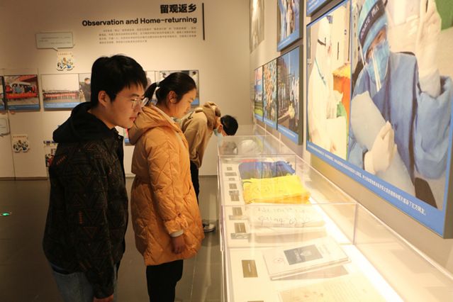 最后,同学们走进了“火神山·雷神山”医院建设纪实展馆。这一展馆带领同学们回顾了疫情暴发时期,无数个凡人英雄义无反顾来到武汉支援火神山和雷神山医院建设的历史。一张张现场照片、一份份紧急文件、一面面鲜红旗帜,再一次为同学们讲述了可歌可泣的抗疫故事,传达了伟大的抗疫精神。同学们看着这些照片,眼眶不免湿润。大家静静地凝望着照片里那些不顾一己之身、为保护人民群众的生命健康安全做出牺牲的平凡英雄,表达着对他们深深的敬意。