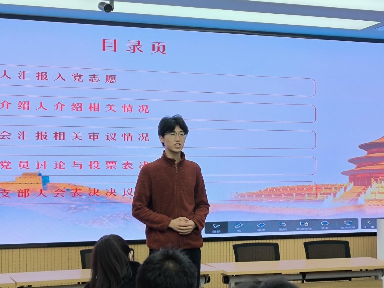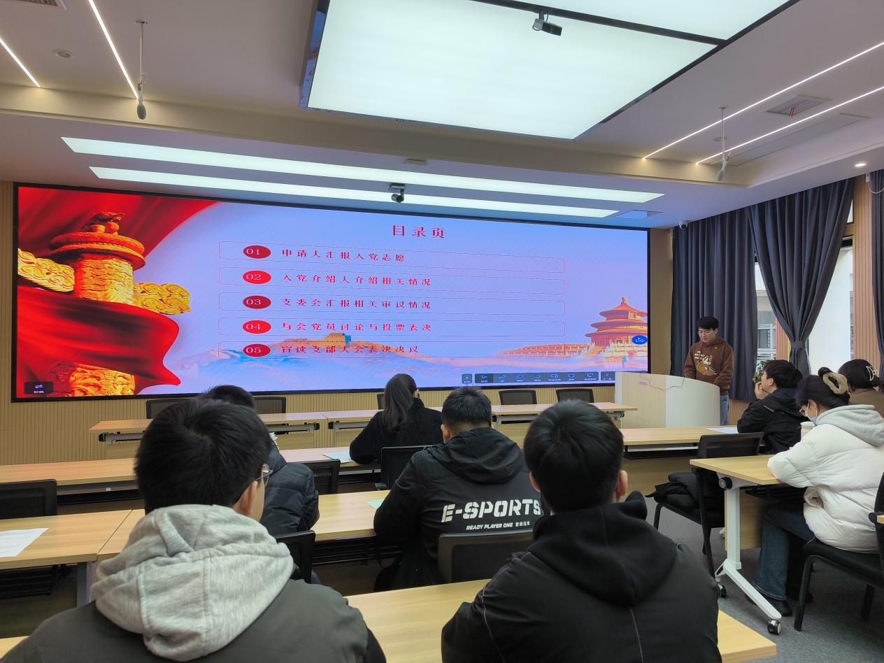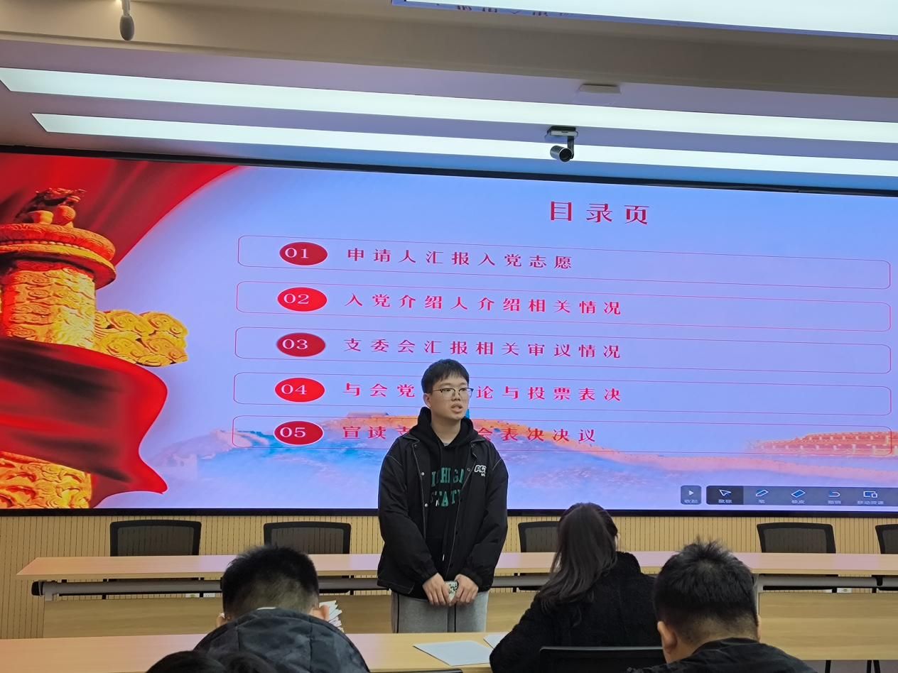 随后,由各位发展对象的入党介绍人,介绍各位发展对象的相关情况。由支部书记李荔老师代表支部委员会报告杨鑫鹏、郑沁梅、唐子敬、李佳乐、简宇凡、卢成霞、杨睿中、郭珊、曾琴、胡可同志的教育考察情况,提出同意接纳10位同志为预备党员的意见。
