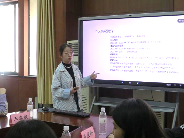 随后,由张雨萌同学分享自身经验。她向大家介绍并推荐了获取备考信息的渠道;同时她分享了自己丰富的面试经验,建议大家在打牢理论基础的同时一定要保持“个性化”,让自己变得自信且有亮点,从而在奋斗之路上获取成功。