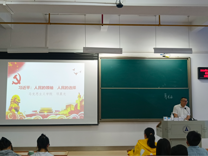 紧接着,由马克思主义项晨光副教授为同学们讲授《习近平:人民的领袖人民的选择》主题课。他以生动的语言结合具体事例向同学们讲述了习近平总书记是如何在家庭熏陶、个人理想等因素影响下逐步成长为人民领袖的。同时他围绕大局、紧跟时事,引导同学们坚定人生目标,练就过硬本领,勇担时代重任。