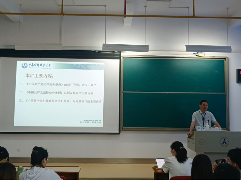 首先,在《中国共产党纪律处分条例》主题课中,公共管理学院李明强教授从修订背景、意义和要义,总则、分则、附则及修订的主要内容等方面进行了讲解。他指出,条例修订更加突出了纪法协同、纪法衔接,进一步严明了政治纪律和政治规矩,把严要求贯彻到了党规制定、党纪学习教育、执纪监督全过程。同时,他勉励同学们在日常生活中严格遵守党的纪律,积极发挥党员的先锋模范作用,加强自我监督和接受他人监督。