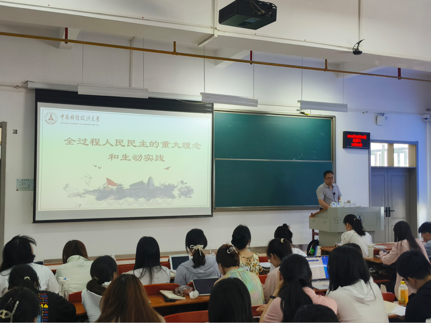 接下来,公共管理学院李云新副教授为同学们讲授了《全过程人民民主的重大理念与生动实践》的主题课程。他开门见山地指出,发展全过程人民民主能够更好适应纷繁复杂的超大社会现实,推进解决我国当前面临的发展不平衡不充分难题,不断满足人民日益增长的美好生活需要。随后,他从多个案例出发,结合视频素材,让同学们更加深刻地认识到了我国全过程人民民主的理念及其在现实中的生动实践。
