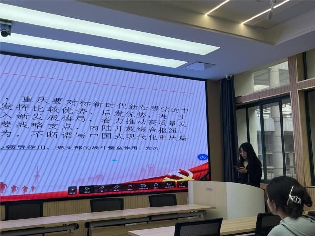 接着李璇同志领学《习近平在重庆考察时强调进一步全面深化改革开放不断谱写中国式现代化重庆篇章》,习近平总书记指出要充分发挥比较优势、后发优势,进一步全面深化改革开放,主动服务和融入新发展格局,着力推动高质量发展,奋力打造新时代西部大开发重要战略支点、内陆开放综合枢纽,在发挥“三个作用”上展现更大作为,不断谱写中国式现代化重庆篇章。这也是对我们青年党员的要求,要求我们深入理解新发展格局内涵,把握“百年未有之机遇”,积极投身新时代西部大开发,助力谱写我国现代化新篇章。