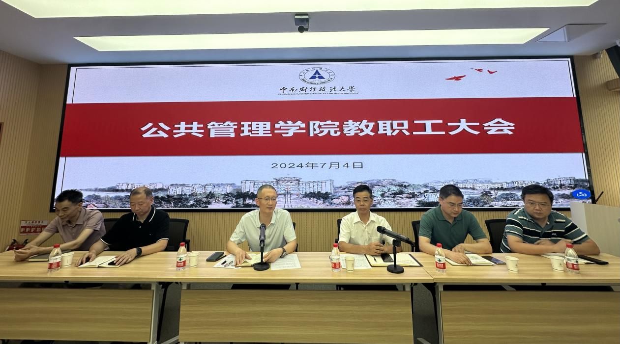 新闻网讯(通讯员 向双申 田雨)7月4日,公共管理学院召开教职工大会,院长兼党委副书记张广科,党委书记王建荣,党委副书记刘茂盛,副院长田艳平、熊卫、田进及全院教职工参加会议,会议由张广科院长主持。