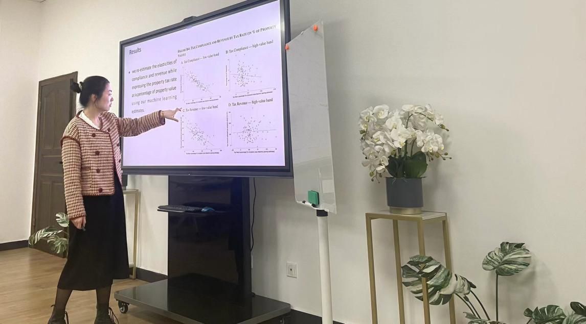 接着,财税学院博士生罗喆从文章背景、研究成果和政策启示三个方面,分享了哈佛大学学者Augustin Bergeron及其团队最新发表的论文《The State Capacity Ceiling on Tax Rates: Evidence From Randomized Tax Abatements in the DRC》,该论文探讨了低收入国家如何通过税率和税收征管能力来提升税收收入。在点评论文的数据分析部分时,两位老师提醒同学们,在进行一致性分析时,应先明确所要验证的内容,再寻找相应的观点或假设。分享结束后,参会的同学们踊跃提问,现场气氛热烈。