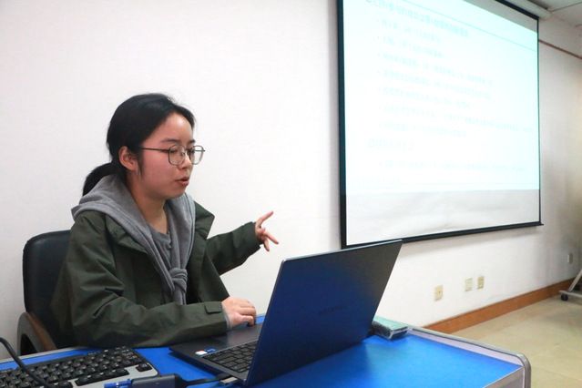 会议伊始,戚亦浓进行分享,她结合自身参加科创比赛的经验展开宣讲:首先,她提出要学会主动查找、筛选赛事信息,例如从学校教务部、团委官网等找到、并仔细阅读、分析比赛通知;其次是要结合时政热点选择研究项目,她以自身参与的博文与大创项目为例,详细阐述了如何从兴趣出发,并结合时代需求找到具有研究价值的课题;最后她提到要有条理地组建项目团队,同时也一定要注意比赛通知中关于人数以及人员比例的要求,此外她还建议,在条件允许的情况下,可以考虑跨校组队,以此来提高项目的成功率。