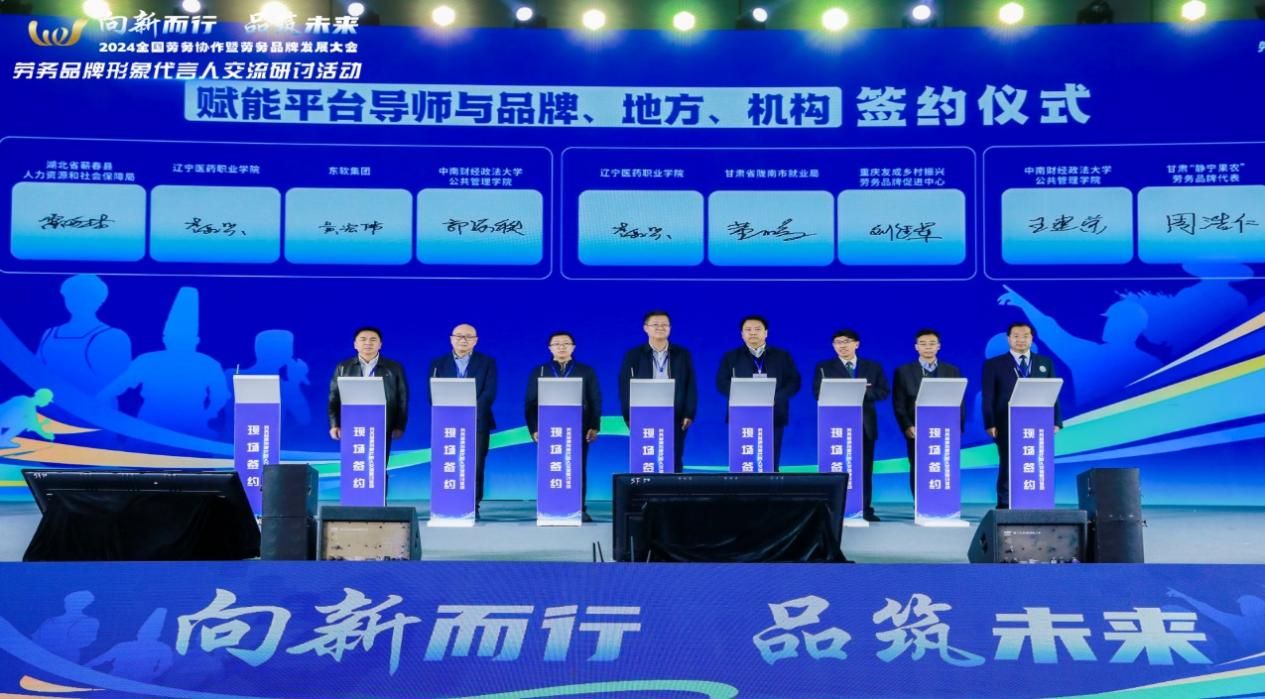 在劳务品牌形象代言人交流研讨活动环节,李波教授特邀作“文化赋能:蕲春艾灸师劳务品牌”专题发言,并担任青年创业单元和技能人才促进品牌发展单元两个环节的特邀主持人。王建荣书记和黄宏伟副教授分别代表学院与甘肃“静宁果农”劳务品牌和湖北省蕲春县人社局签订框架合作协议。