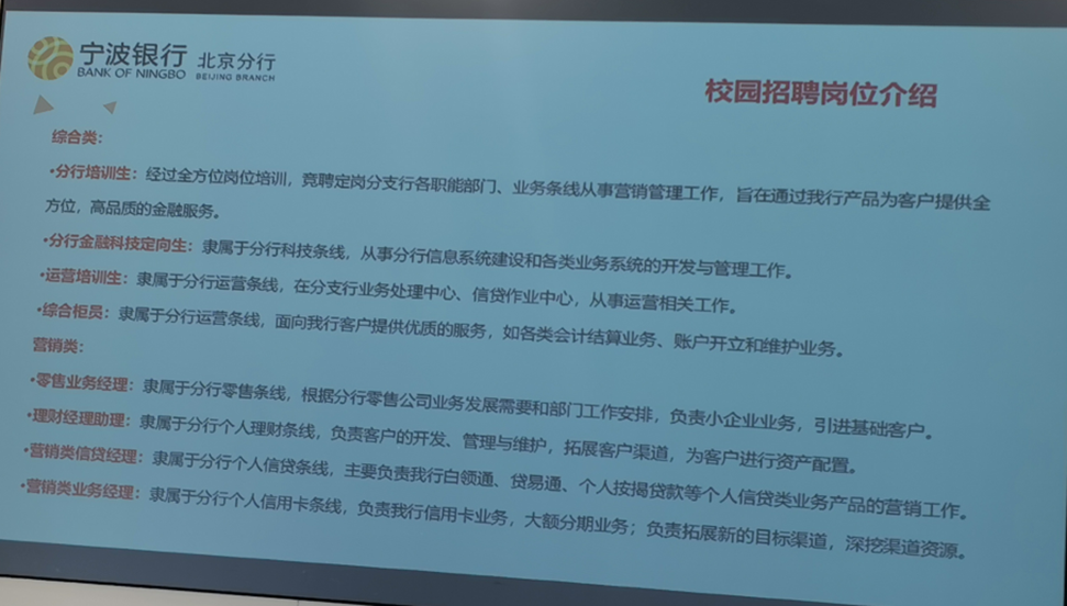 座谈交流中,宁波银行北京分行校园招聘负责人王大川详细介绍了该行校园招聘岗位、入职面试测评流程等,讲解了对入职员工在工作态度、学习能力、专业能力、沟通能力、团队协作、适应能力等方面的要求。周晓曼总经理还特别提到,宁波银行招聘毕业生并无修读专业的限制,重点考察的是毕业生的沟通能力、逻辑能力、抗压能力、工作配合度、个人品行等。