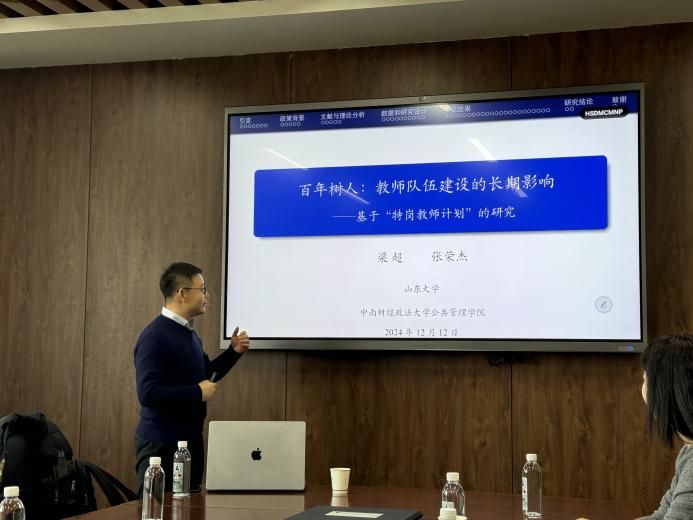 紧接着,梁老师进一步分享了研究方法与数据来源。他的研究以定量分析为主,依托全国范围内的普查数据和区县层面的招聘数据,全面评估特岗教师计划的实施效果。梁老师通过深入分析该计划对学生受教育年限、成绩及升学率的具体影响,并综合考虑区域经济差距、人口密度等变量,确保了研究结论的科学性与稳健性。