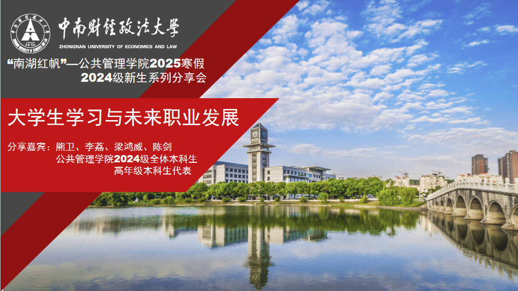 新闻网讯(通讯员:石浩炜)为帮助大一新生更好地适应大学生活,明确学习目标和职业发展方向,公共管理学院于2025年1月12日下午举办了主题为“大学生学习与未来职业发展”的线上分享会。本次活动是“南湖红帆”系列指导活动之一,“南湖红帆”由“南湖扬帆计划”改名而来,旨在为大学生提供全过程、全方位的指导,助力其全面发展、成长成才。本次活动也是公共管理学院2024级本科生2025寒假聚力助航活动的第一期,据悉,该活动还将连续举办四期,由学院四个系依次承办,贯穿寒假全程,助力公管学子更好启航更好前行。