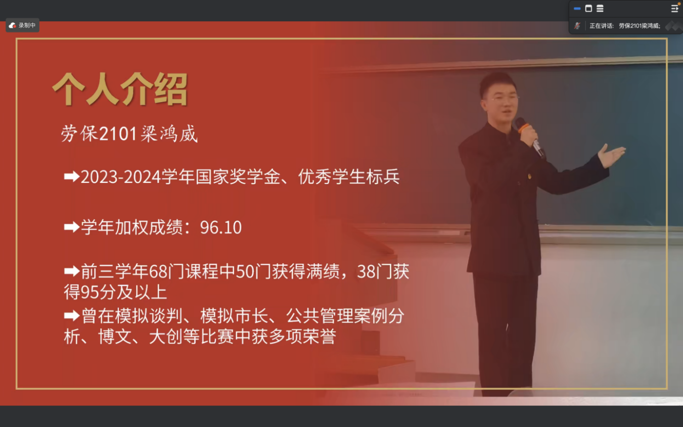 梁鸿威,公共管理学院2021级优秀学生标兵,分享了自己在大学中的学习经验,强调要摒弃高中时期唯考试论的学习方法。他鼓励同学们积极参与科研、竞赛等学术活动,以提升综合素质。