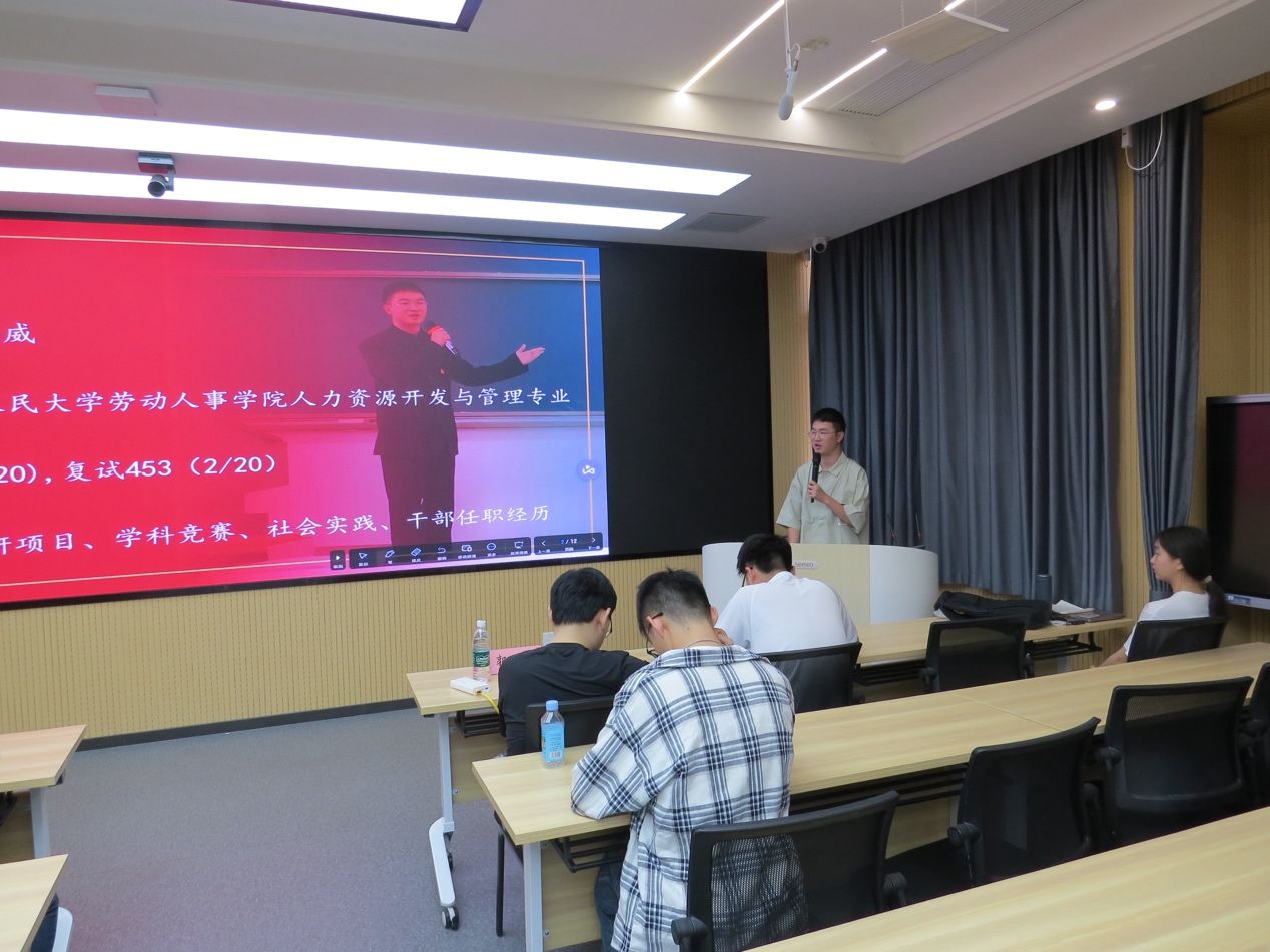 最后,由考研至中国人民大学的梁鸿威进行分享。他建议同学们在确定考研目标时要先定专业再定学校,专业选择要结合本科基础和兴趣,院校选择要考虑专业适配度、学校资源多方面因素。他指出,同学们备考时应灵活运用各种方法进行多轮背诵专业课知识点,例如简化内容、关注时事、模拟考试等,还要保持长期、规律的复习和稳定平和的心态,坚持就是胜利。