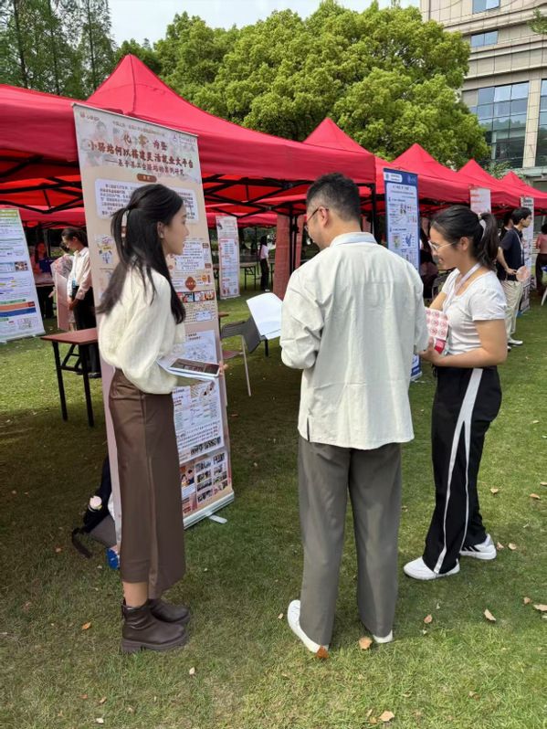 在路演环节,三支队伍通过精心制作的易拉宝系统呈现研究成果。公共事业管理专业2022级本科生饶粤慧团队(成员:顾一泺)通过对绍兴市越城区坡塘村从危房遍布、收入微薄到环境优美、生活富裕的大转变进行深入研究,总结出其华丽转身的背后逻辑,为乡村治理带去可复制经验。行政管理专业2022级本科生庄文灿团队(成员:阳汶珊,黄欣媛)以武汉市QK驿站为研究对象,利用AGIL理论构建工会驿站培育灵活就业新生态的理论分析框架,旨在揭示其功能机制,探索零工治理新实践。行政管理专业2023级本科生张楚瑜团队(成员:拜晗,羿美怡,丁哲慧,陈娜)探究海南自贸港建设中的人才留用创新之路,提炼出“优化待遇—视野共创—情感联结”的留用路径,为破解季节性流动人才转化难题提供“海南方案”。