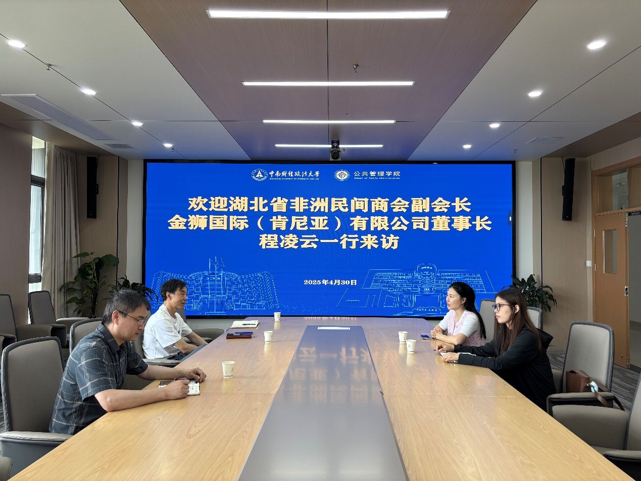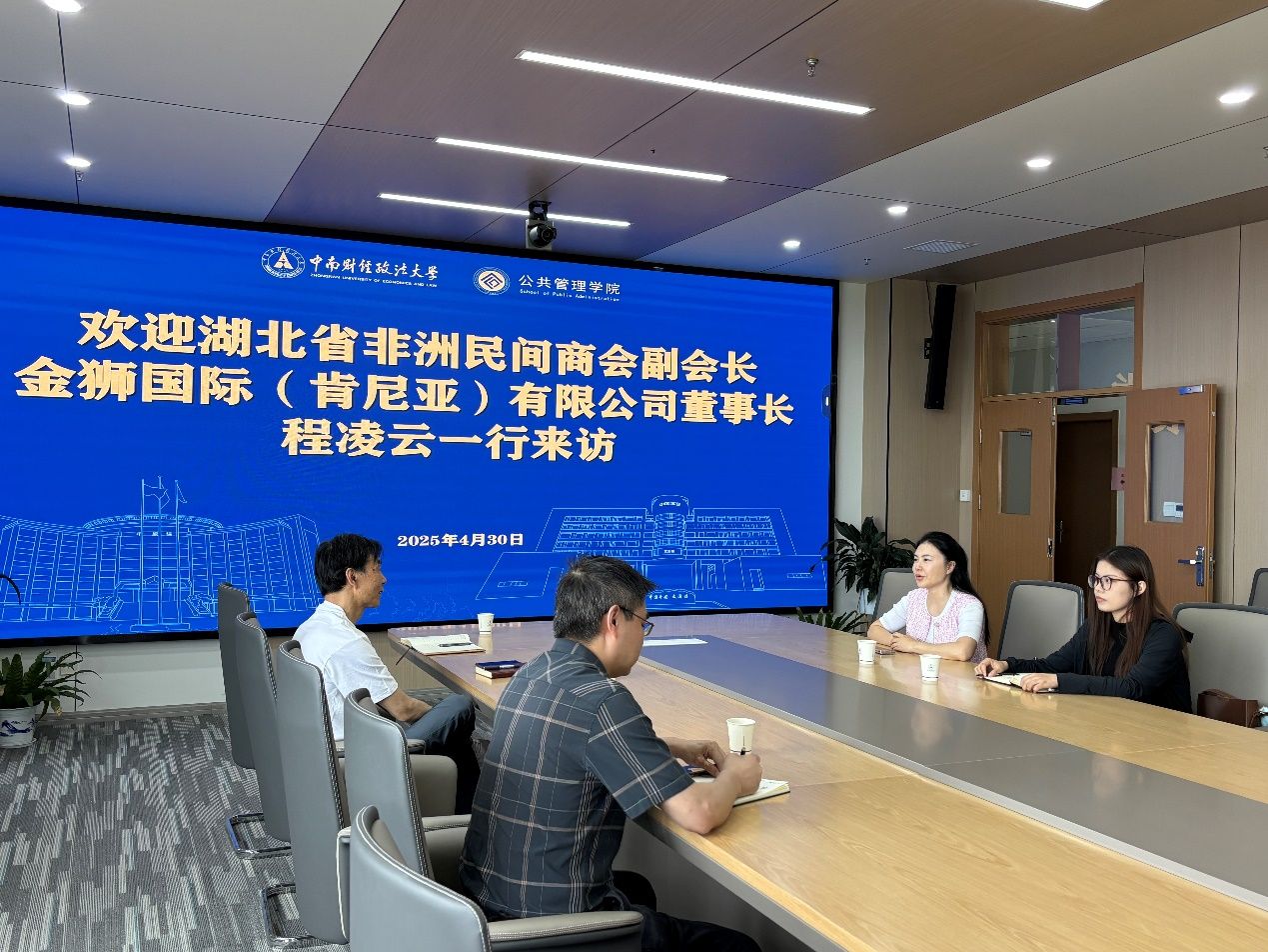 新闻网讯(通讯员 何美丽)为搭建校企对话平台,助力学生职业发展,探索产学研合作新路径,4月30日,公共管理学院与湖北省非洲民间商会副会长、金狮国际(肯尼亚)有限公司董事长程凌云一行在文瀚楼东801会议室开展洽谈。学院党委副书记刘茂盛、副院长熊卫、本科生毕业年级辅导员石玉出席了会议。