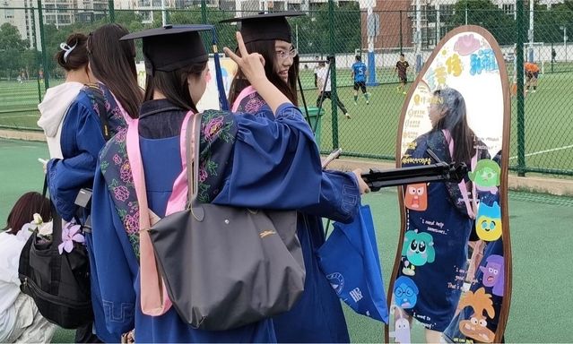 两面全身镜化身情绪画布,丙烯马克笔写下“不要焦虑”“我很努力”等夸赞自己的话语。同学们对镜彩绘、拍照打卡,在镜像与色彩的碰撞中,重新发现自己的闪光点,解锁与内心对话的新方式。