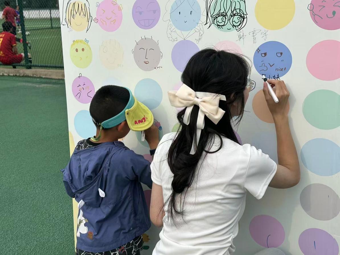 笑脸彩绘展板成为网红打卡点!同学们用马克笔勾勒出专属笑脸,鲜花和笑脸气球奖励让现场充满欢乐。当多彩涂鸦汇集成巨型笑脸墙,每个人都在共创中见证了“快乐会传染”的魔法。