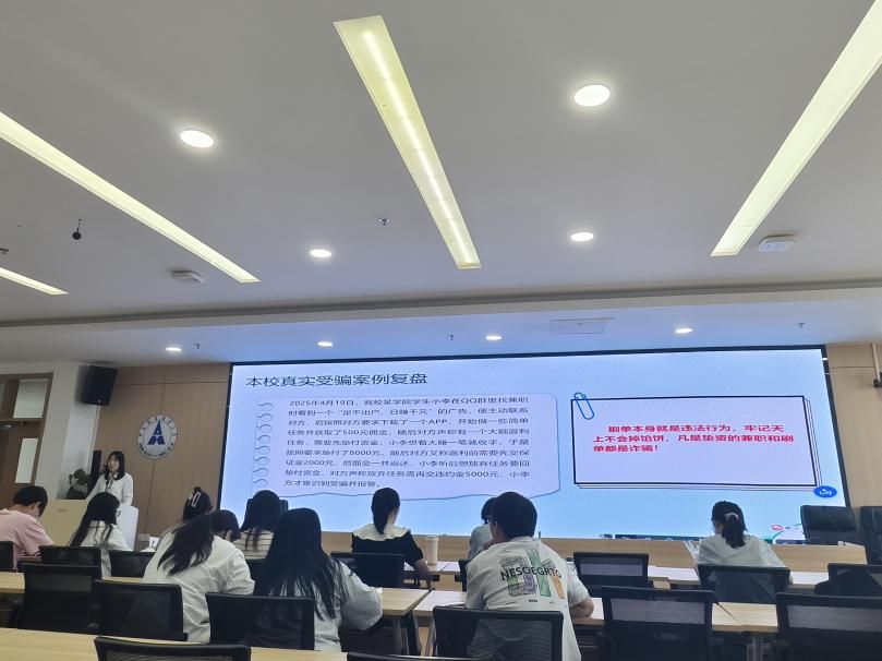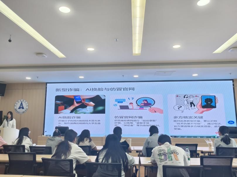 为让诈骗手段“现出原形”,石玉老师向同学们介绍了常见的电信诈骗类型及套路,包括刷单返利类的兼职陷阱、冒充熟人或老师类的情感绑架、网购或客服类的信任伪装和AI换脸与仿冒官网等,让同学们熟知电信诈骗套路以减少上当受骗。