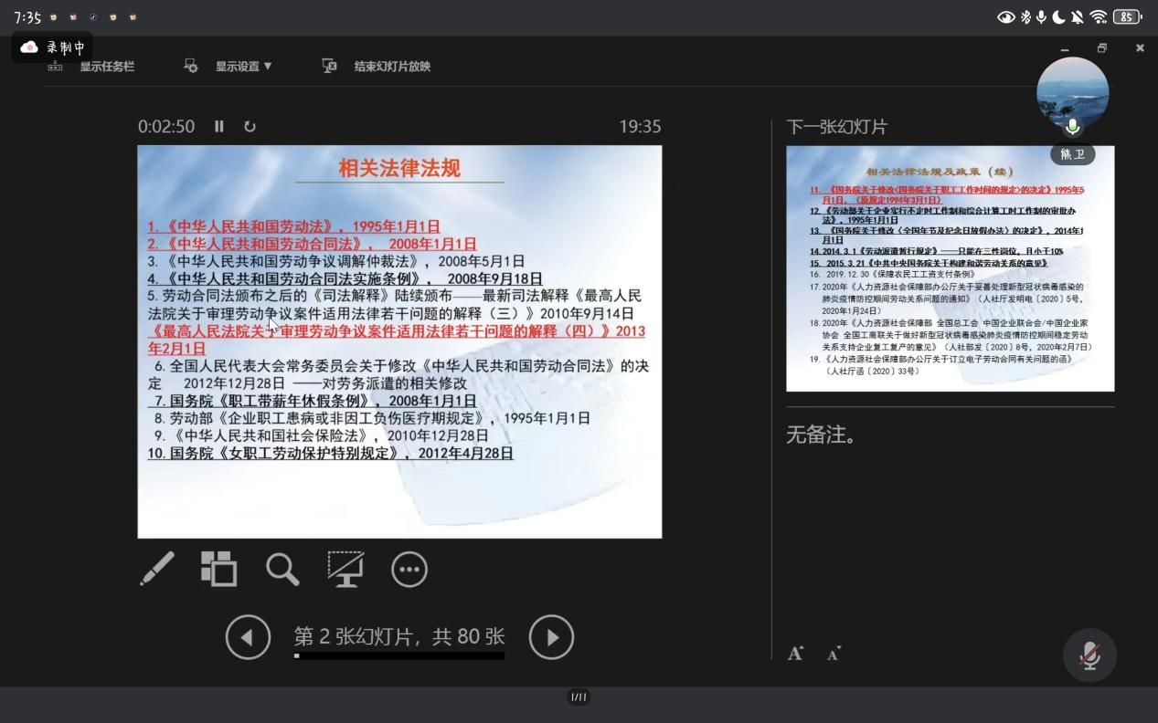 熊卫教授以《集体谈判劳动法与应用》为主题开启首讲。他如一位严谨的 “法律向导”,梳理了从1995年《中华人民共和国劳动法》颁布至2025年的近30部核心劳动法律政策 —— 从《劳动合同法》《劳动争议调解仲裁法》等基础法律,到《职工带薪年休假条例》《女职工劳动保护特别规定》等专项条例,再到相关司法解释与政策文件,为同学们构建起清晰的法律知识图谱。他特别强调,集体协商谈判中职工共性问题往往涉及多条法条,“合法是底线,共赢是目标”,这句箴言让学子们深刻领会到法律在谈判中的基石作用。