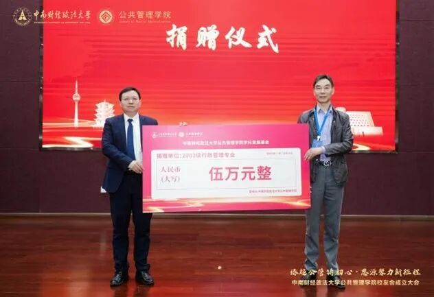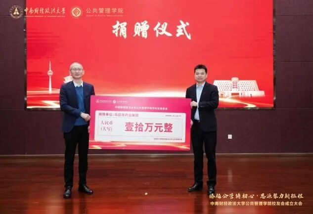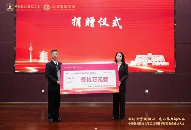 捐赠仪式环节传递着校友对母校的深厚情谊。马应龙药业集团股份有限公司党委书记宋志奇委托集团线下营销总部总经理黄术,代表集团向学院捐赠10万元;湖北全维数字技术有限公司总经理高宏女士代表公司向学院捐赠10万元;学院援疆教师苏忠林心系学院校友会大会工作,作为2002级行政管理专业辅导员,带头并组织班上许望平等同学牵头发起班级募捐,全班同学共计募集助学金5万元,同时许望平同学个人现场还追加捐赠1万元,以支持学院校友会的工作。各捐赠代表发表了捐赠感言,黄术对校友会的成立表示热烈祝贺,并送上期许:愿校友会扬帆起航、汇聚英才;愿校友会蓬勃发展,成为所有公管人的幸福家园;愿公管学院桃李满天下,持续谱写发展华章。高宏在祝贺校友会圆满成立的同时,分享了企业的公益初心。企业于疫情期间已捐赠约一千万元,未来将持续投入一百万元,专项资助有需要的优秀学子,助力成长成才。许望平则动情回忆大学生活:虽时光短暂,但情谊深厚。他坦言,此次捐赠是“饮水思源”,感谢母校师长的悉心教诲,更希望以“抛砖引玉”之举,带动更多校友支持母校,助力学子成长。