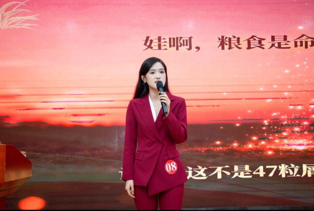 决赛现场,高煜涵同学以《麦芒中的接力,传承里的守望》为题,以“47粒馒头屑”为核心线索,串联起一段跨越时空的精神传承。她从爷爷珍惜粮食的日常教诲,讲到抗战时期老班长为守护干粮英勇牺牲的壮烈往事,情真意切,感人至深。她的演讲巧妙结合党的二十大报告中“全方位夯实粮食安全根基”的战略部署,以及二十届四中全会“十五五”规划建议里“传承红色基因”的明确要求,将个人家庭记忆升华为时代新人的责任担当,彰显了青年一代“复兴有我”的坚定信念。