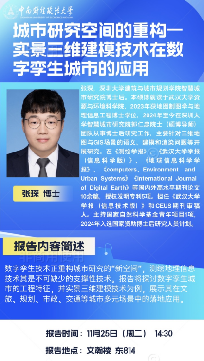 报告人简介:张琛博士,目前为深圳大学建筑与城市规划学院智慧城市研究院的博士后。本硕博就读于武汉大学资源与环境科学学院,2023年获地图制图学与地理信息工程博士学位,2024年至今在深圳大学智慧城市研究院郭仁忠院士(硕博导师)团队从事博士后研究工作,主要针对三维地图与GIS场景的语义、建模和渲染等问题开展研究。在《测绘学报》、《武汉大学学报(信息科学版)》、《地球信息科学学报》、《Computers, Environment and Urban Systems》《International Journal of Digital Earth》等国内外高水平期刊发表论文10余篇,授权发明专利5项。担任《武汉大学学报(信息科学版)》和CEUS期刊审稿人。主持国家自然科学基金青年项目1项,2024年入选国家资助博士后研究人员计划。