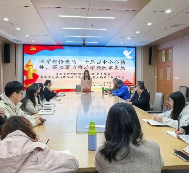 新闻网讯(学生通讯员:许娜王怡静)为深入贯彻落实党的二十大和二十届历次全会精神,加强基层党组织联建共建,在学校关心下一代工作委员会指导下,深化 “老少支部共建” 工作,充分发挥 “五老” 传帮带作用,2025年11月27日,公共管理学院研究生2501党支部与离退休党委竹苑总支第二党支部联合开展主题党日活动。离退休党委竹苑总支书记李汉文、竹苑总支第二党支部书记郭雷生及程传耀、赖思源两位离退休党员与研究生支部全体党员参加了此次活动。活动由研究生2501党支部委员王怡静主持。