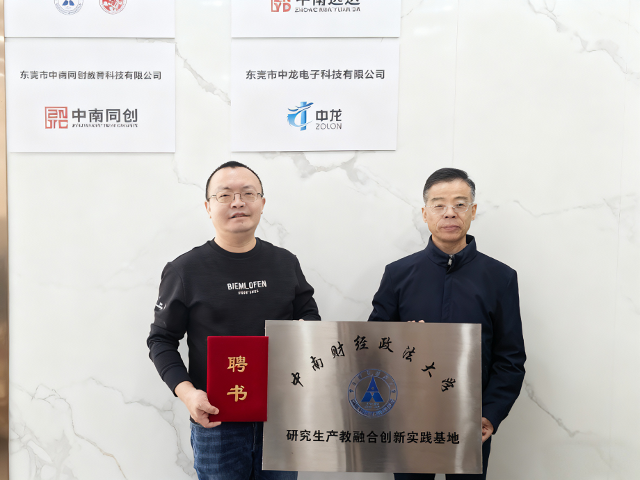在中龙电子科技有限公司听取了该公司作为行业信息化解决方案供应商的业务介绍。随后,王建荣向公司董事长、校友卢义龙颁发MPA行业导师聘书,双方共同为“中南财经政法大学研究生产教融合创新实践基地”揭牌,标志着校企协同育人迈出实质性一步。