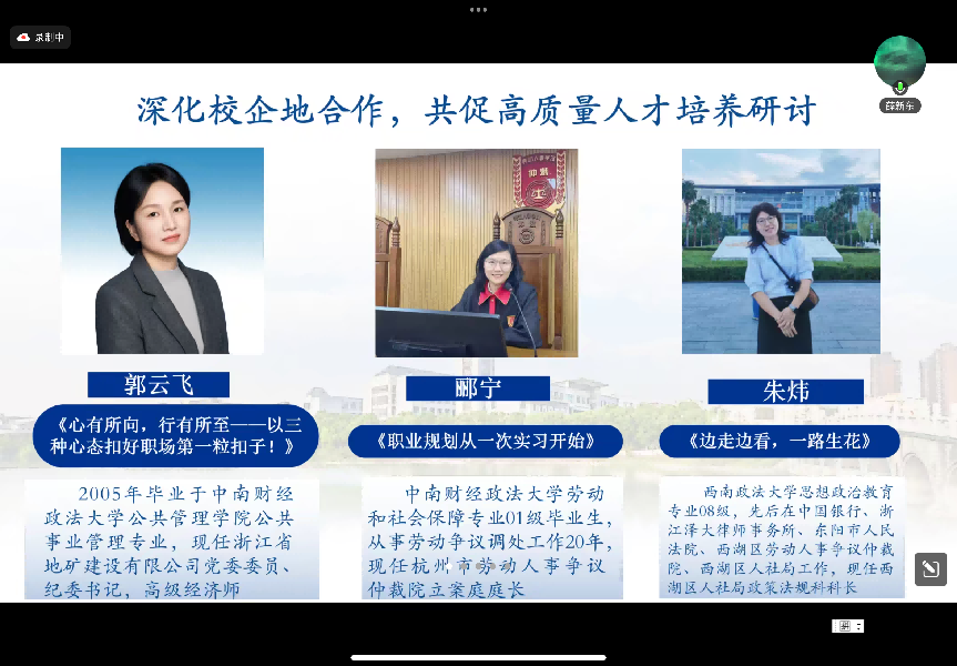 新闻网讯(学生通讯员:高玥)2025年11月27日晚,为深化高质量人才培养,搭建政校企协同育人桥梁,米兰电竞·(中国区)公共管理学院劳动与社会保障系成功举办“深化政校企合作,共促高质量人才培养研讨”线上研讨会。会议由薛新东教授主持,特邀三位来自不同领域的杰出校友嘉宾分享经验,工商管理学院熊卫副院长、公共管理学院于长永副主任全程参加指导。