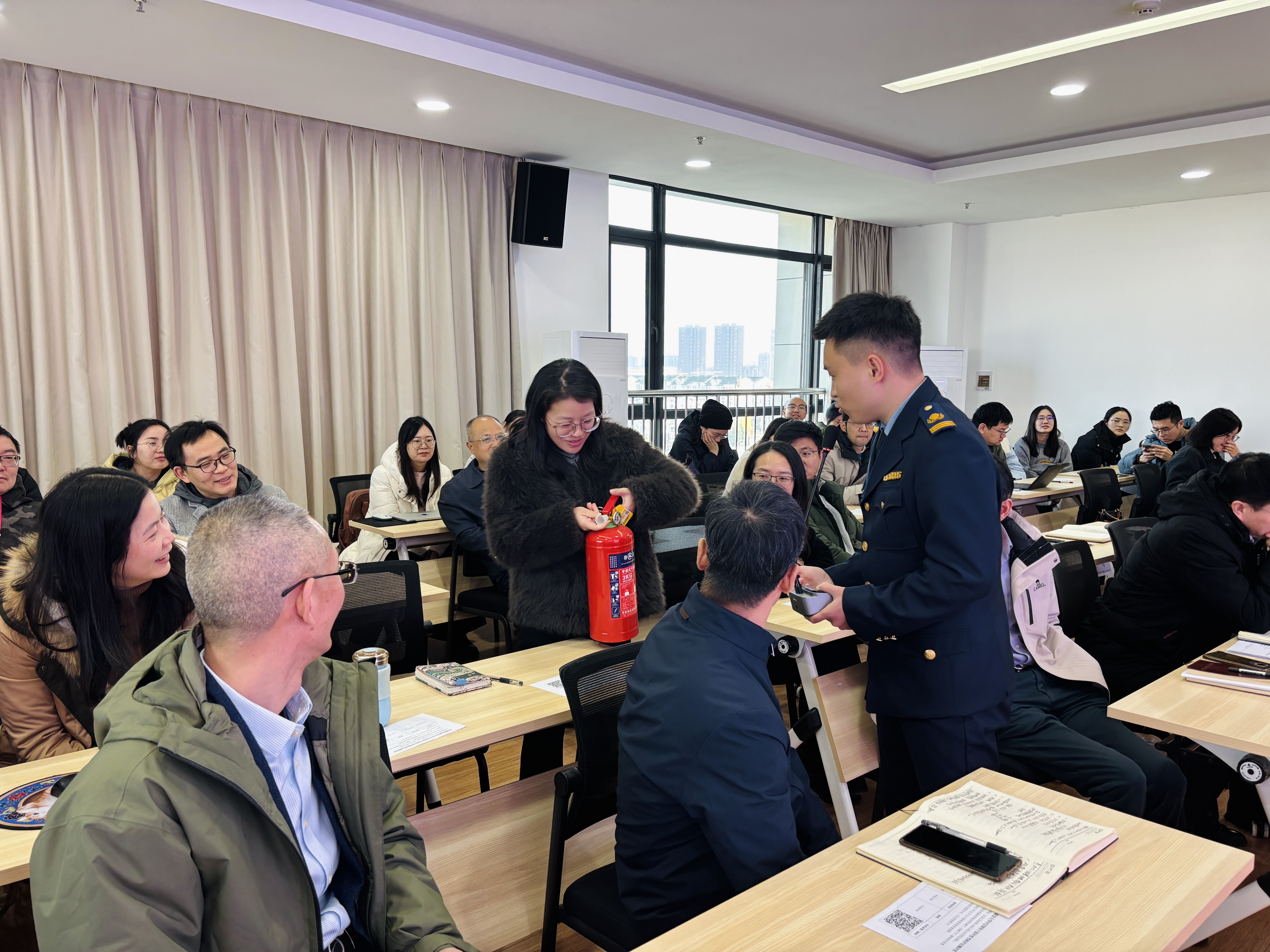 教官结合近年来国内发生的多起典型火灾案例,从火灾成因分析、初期扑救方法、疏散逃生技巧等关键维度展开系统讲解,重点剖析了家庭住宅、办公楼、办公室等场景的火灾隐患点,并针对违规用电、易燃物品违规存放等常见风险行为进行专项警示,切实增强教职工的风险识别能力。通过现场演示与互动教学,详细讲解了灭火器的“提、拔、握、压”四步操作法及使用注意事项,指导教职工掌握初期火灾预防、火灾扑救、应急处置及自救互救的关键技能。