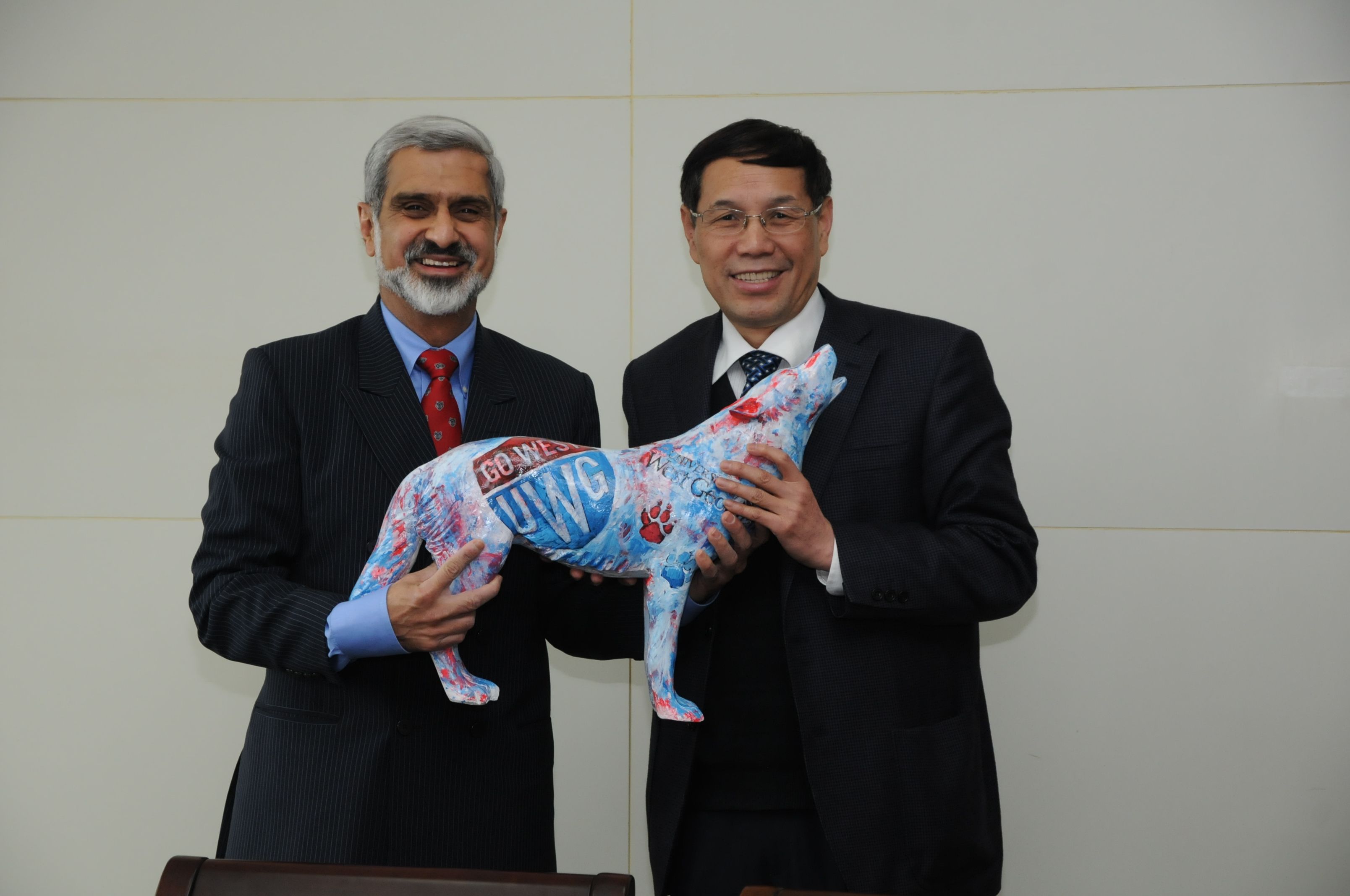 美国西乔治亚大学校长BeheruzN.Sethna博士和国际项目主任William Schaniel 博士应邀于2013年2月23日至26日访问了我校。 我校吴汉东校长于2013年2月25日在五楼会议室与客人举行了亲切会谈。此次见面是两位校长的第三次见面,两位校长共同回顾了两校自2010年以来的交流合作及取得的重大成果。我校金融学院至今已有26位学生参加两校的“2.5+1.5”本科生联合办学项目并获得两校的学士学位,另有80多名学生将于今明两年赴西乔治亚大学留学。BeheruzN.Sethna校长表示希望以已有的学生项目合作为基础,将两校合作拓展到市场营销、管理等多学科,合作形式从学生项目拓展至教师交流等。参加此次会谈的还有,国际交流部徐文健部长、任翛副部长、金融学院唐文进副院长和李志生副院长。 随后,西乔治亚大学校长代表团与我校金融学院领导、老师及学生进行了交流,为即将赴美留学的学生解答疑问。