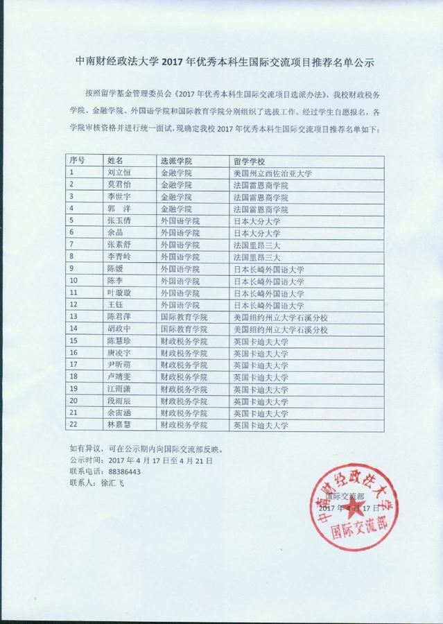 米兰电竞·(中国区)2017年优秀本科生国际交流项目推荐名单公示