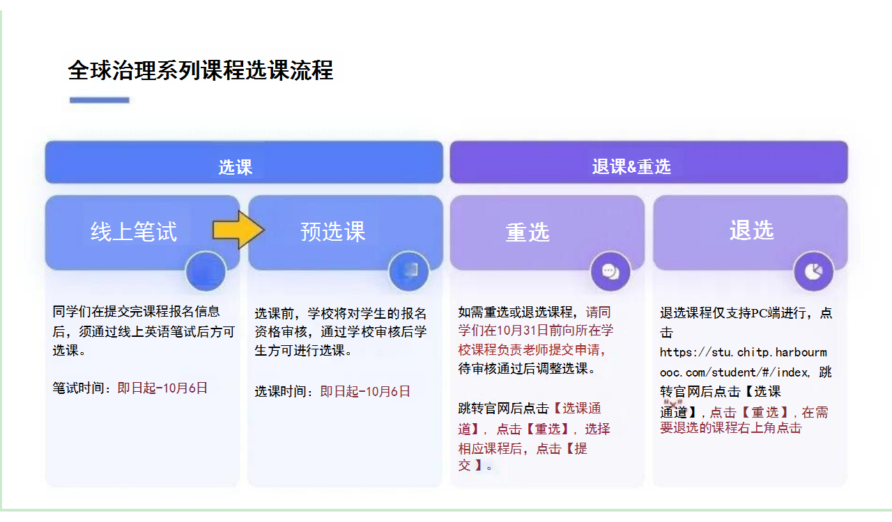 根据相关安排,第六届“全球治理青年人才精英班”线上课程正式开启报名通道。报名、笔试、及课程预选截止时间为10月6日。