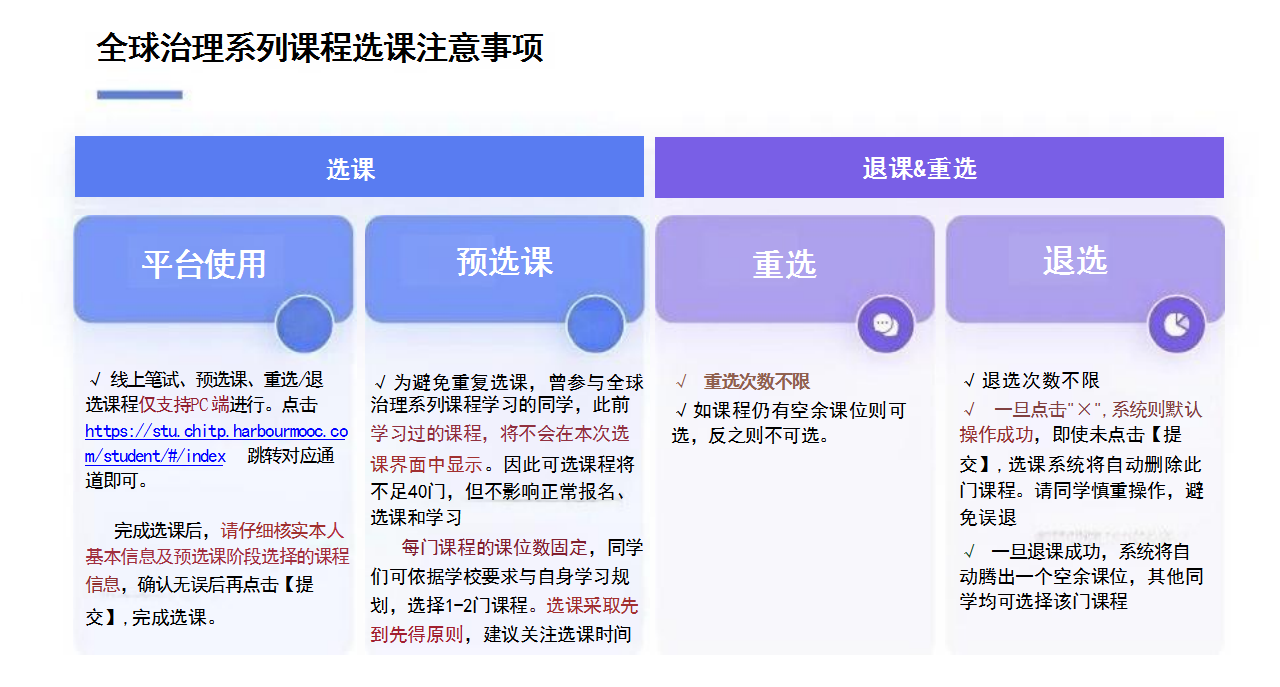 请各位同学注意按照本通知的时间完成报名、笔试、以及课程预选,未按期完成的同学视为自动放弃;此选课环节为预选课(选课成功不代表最终录取结果,最终结果以面试后公布的入选名单为主,面试时间和地点将另行通知)。