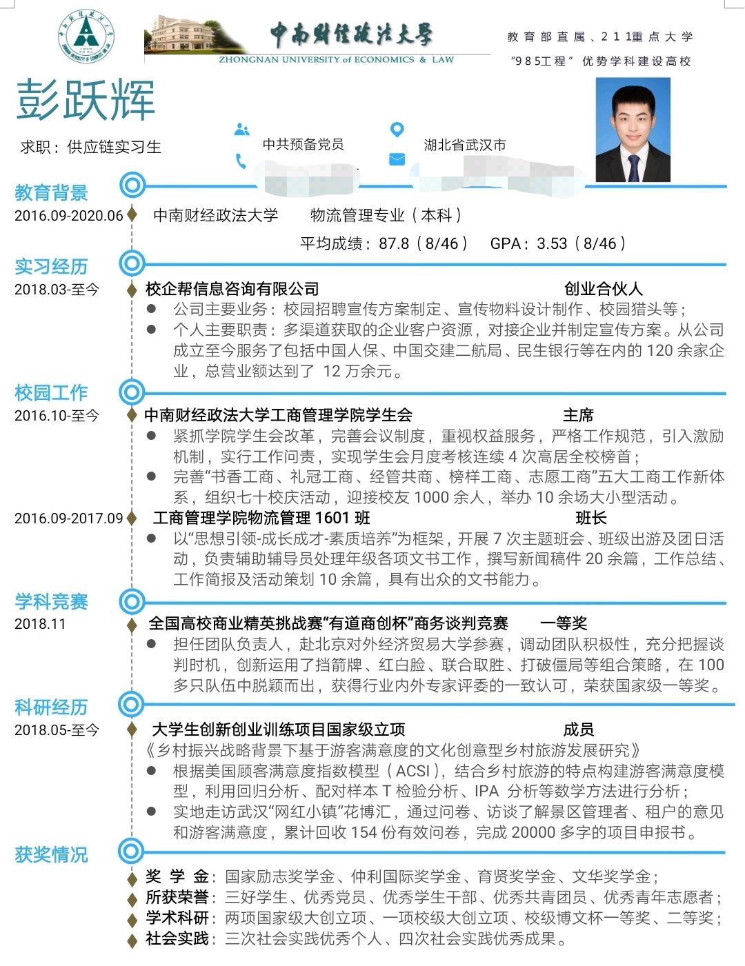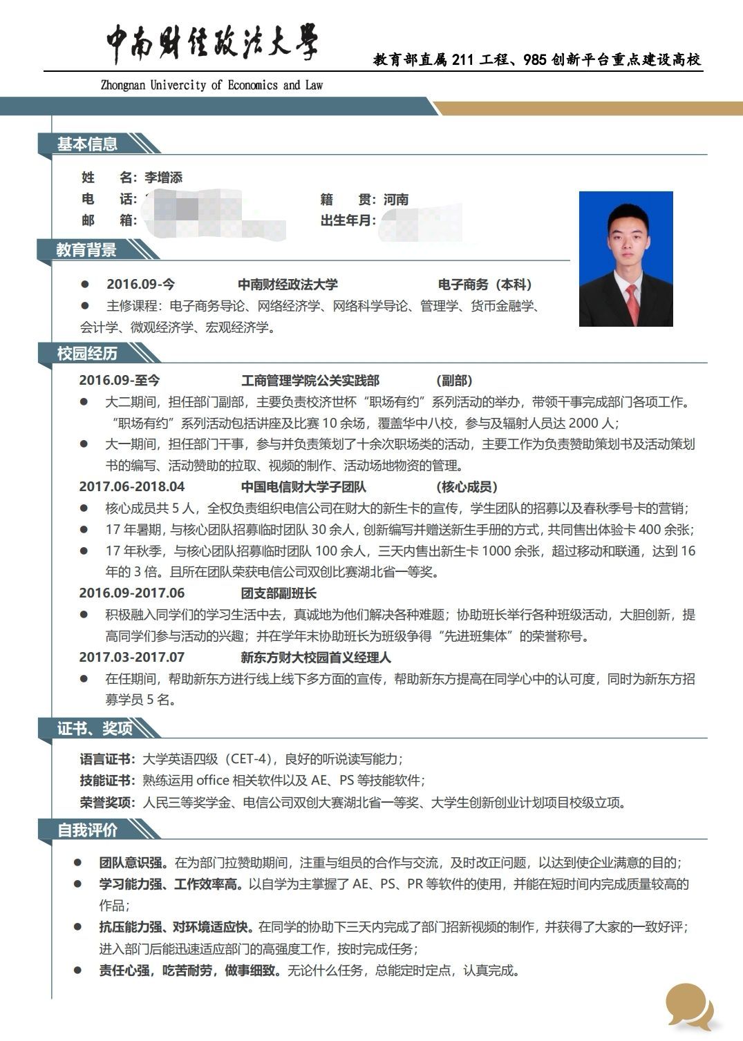 春暖花开,扬帆启航;整装待发,规划未来。为了满足未来求职的需要,增强同学们的择业意识和竞争意识,帮助同学们更好地规划大学生活,掌握求职简历的制作方法和技巧,在工商管理学院全体师生的组织下开展“职场工商”系列活动之“精‘简’人生、砥‘历’前行”2019年简历制作大赛。根据评分细则经严格评审,本次优秀简历评选结果已经产生,现将获奖名单公布如下: