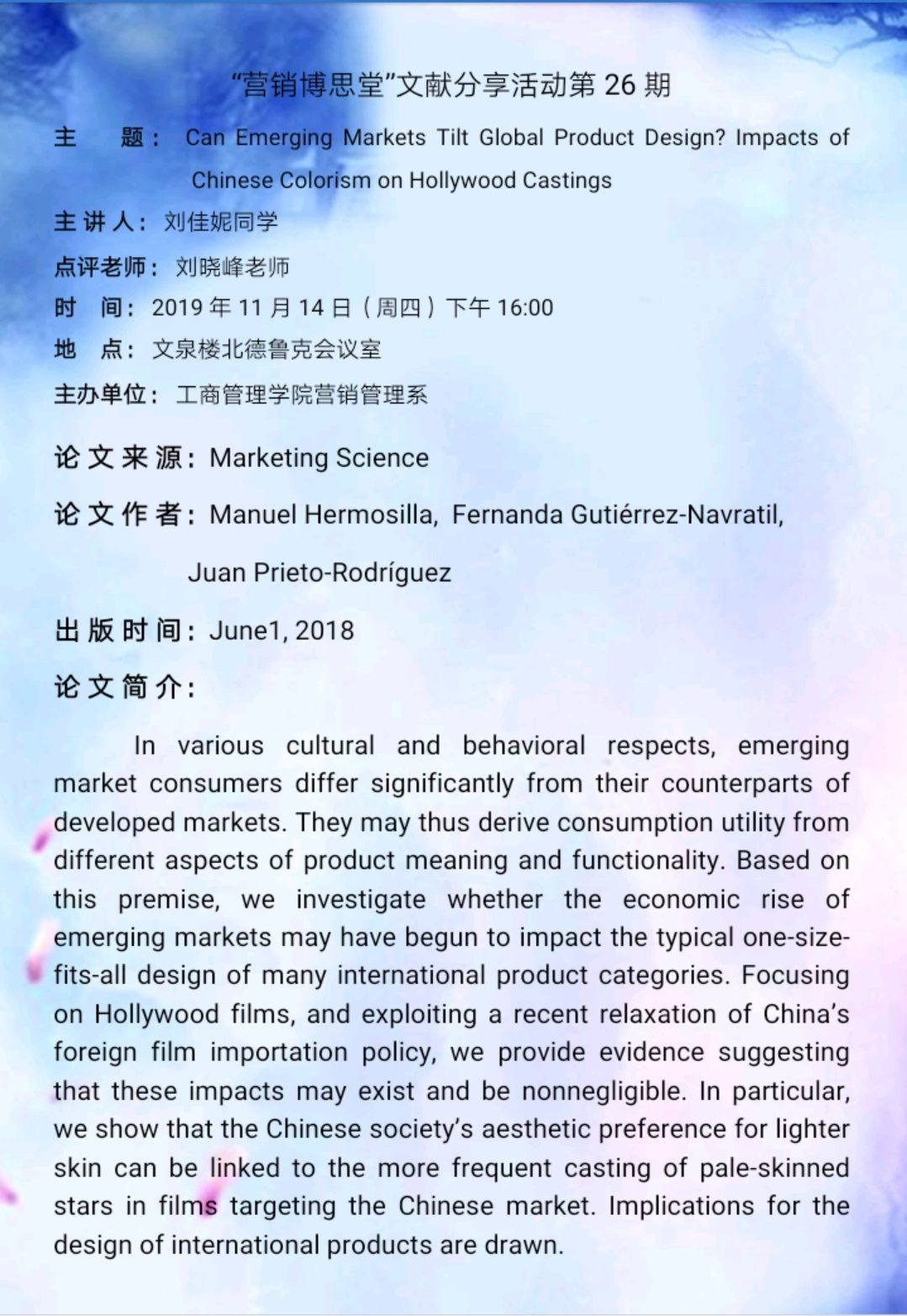 | 11月14日 16:00 | 文泉北510德鲁克会议室 | 营销管理系 | 刘佳妮 同学 | Can Emerging Markets Tilt Global Product Design? Impacts of Chinese Colorism on Hollywood Castings | 详情 |