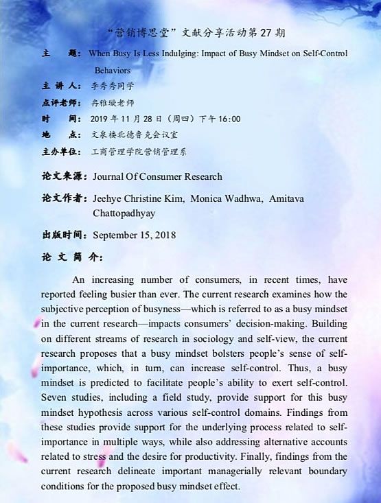| 11月28日 16:00 | 文泉北510德鲁克会议室 | 营销管理系 | 李秀秀 同学 | When Busy Is Less Indulging:Impact of Busy Mindset on Self-Control | 详情 |