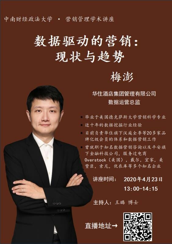 (通讯员:李彤)2020年4月23日13:00-14:15,由工商管理学院营销管理系主办的学术讲座于腾讯会议平台顺利开展。本次讲座由王璐博士主持,主讲人梅澎毕业于美国德克萨斯大学营销科学专业,拥有近十年的数据挖掘行业经验,现就职于华住酒店集团管理有限公司,担任数据运营总监职务。讲座主题为“数据驱动的营销:现状与趋势”。此次讲座的参与对象主要是工商管理学院研究生,平台在线人数多达205人。
