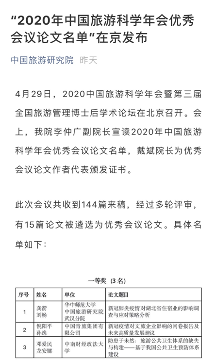4月29日,文化和旅游部主持“2020年中国旅游科学年会暨第三届全国旅游管理博士后学术论坛”在北京召开。本次会议主要围绕“疫情应对与旅游业高质量发展”这一主题进行讨论。经过层层严格评选,评选出三篇一等奖论文,我院旅游管理专业邓爱民教授与其博士研究生龙安娜针对此次疫情所撰写的《防患于未然:旅游公共卫生体系的缺失与构建——基于我国公共卫生预防体系建设》一文脱颖而出,荣获优秀论文一等奖。