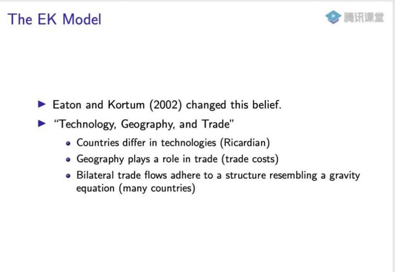 在本次讲授中,沈老师主要介绍了EK模型的发展、优点、假设及其详细推导过程。EK模型,是Eaton kortum 模型的缩写,它是国际贸易相关学科的一个经典模型,在传统的Ricardian 模型对两个国家的两种产品进行研究的基础上,Eaton kortum 模型将问题扩展到多个国家,进行了更加全面深入的分析。