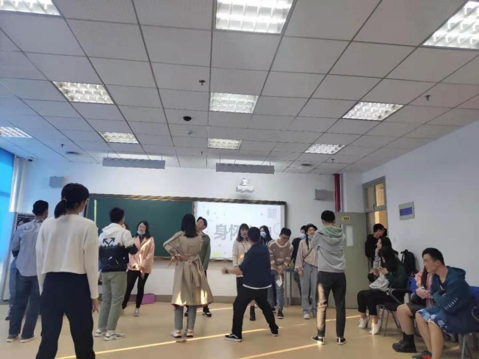 随后开始交友互动环节,一共包括四个小游戏:瞎子穿拖鞋、你来比划我来猜、听音乐抢答歌名和看拼音说词语。瞎子穿拖鞋,要求参加的同学在蒙眼旋转三次后,能够准确穿到6步距离之外预先放置的拖鞋,用时最少的一组获胜。你来比划我来猜需要二人合作,一人看词做动作,一人猜单词,一分钟内猜对数量最多的小组获胜。听音乐抢答歌名,主持人播放流行歌曲,听出歌曲的小组须在报出歌名之后派一人出列正确跟唱一段歌曲片段,方可获得奖励。看拼音说词语,主持人提供的拼音首字母,参与同学需说出对应的汉字词语,说出词语最多的组获胜。四个游戏环节各有特色,在娱乐交流、默契培养以及自我展现等方面激发同学们的参与热情,加深了同学与配对伙伴的相互了解,帮助彼此建立友谊,也使活动现场气氛逐渐热烈。