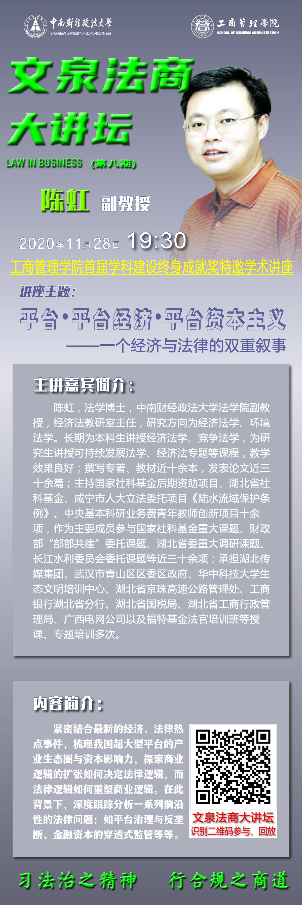| 第八期 | 2020.11.28 19:30 | 小鹅通 | 平台•平台经济•平台资本主义 ——一个经济与法律的双重叙事 (工商管理学院首届学科建设终身成就奖特邀学术讲座) | 陈虹 副教授 | 详情 |