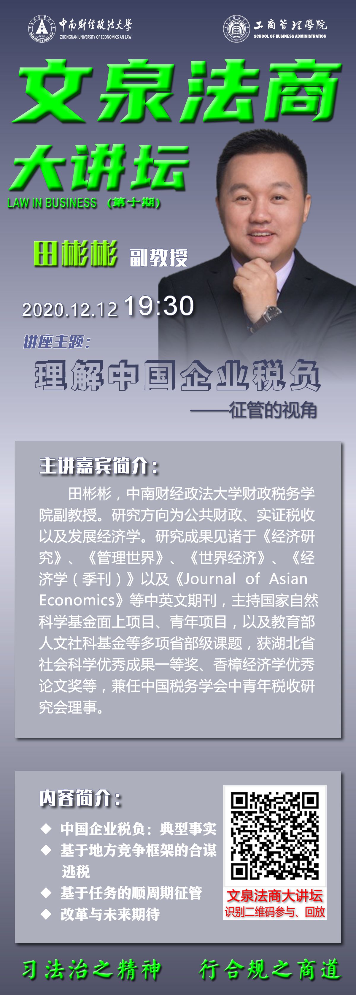 | 第十期 | 2020.12.12 19:30 | 小鹅通 | 理解中国企业税负 ——征管的视角 | 田彬彬 副教授 | 详情 |