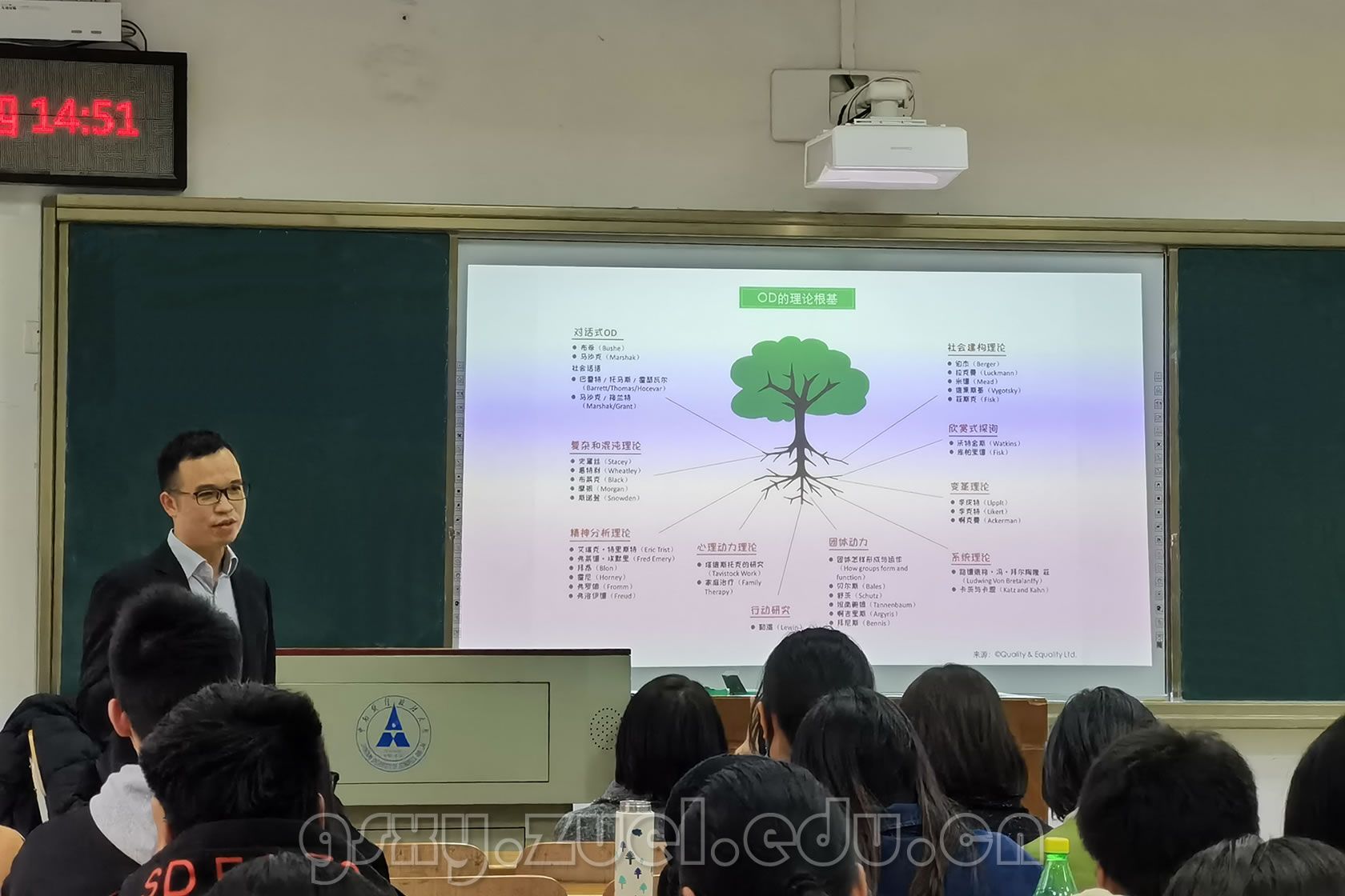 第一场讲座中,邝耀均先生从“明晰概念”和“掌握理论”这两个角度,深入浅出地介绍了组织发展的基础知识与发展前景。在明晰概念模块,邝先生首先介绍了组织发展(OD)的定义,指出组织发展是一个通过实施组织干预措施,进而促进组织与个人变革发展的过程,其目的在于提高组织的有效性。在深入辨析“组织的发展与组织发展”、“组织架构与组织”之间的区别后,邝先生强调要从价值观的角度对组织发展进行理解,指出组织发展的重点是要做到“以人为本”;在掌握理论部分,邝先生向同学们详细介绍了组织发展的理论根基。邝先生着重解释了勒温的变革模型和“场论”,指出组织发展的变革是一个“解冻,改变,再冻结”的过程,并要将组织看作一个“人类社会系统”和“复杂自适应系统”,要根据组织外环境与组织内成员的特点进行“计划性变革”和“涌现性变革”,进而实现科学有效的组织发展。