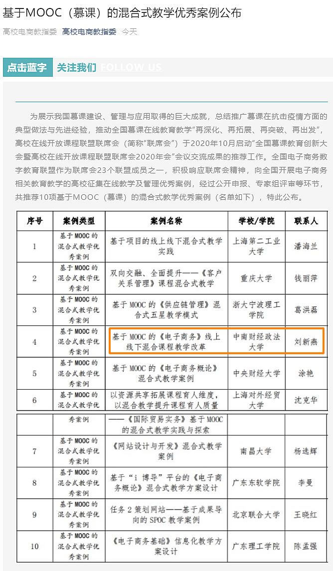我院刘新燕副教授的案例入选为10项基于MOOC(慕课)的混合式教学优秀案例