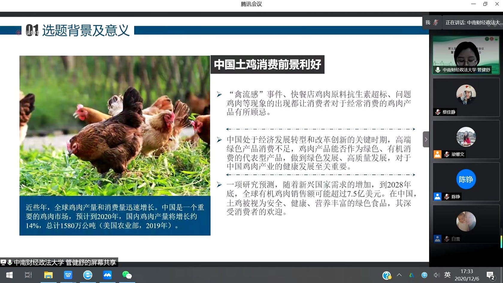 | 为增进学术交流,推动饮食文化的研究、传播与应用,2020年12月5日—12月6日,中山大学旅游学院、中国食文化研究会民族食文化委员会、世界中餐业联合会饮食文化专家委员会联合举办第五届饮食文化生产学术会议暨第六届食文化发展大会,以“地方、族群与可持续饮食系统”为会议主题,通过线上会议的形式,汇集了来自全国各大高校、科研院所、业界的专家学者们,分享地方饮食文化及可持续饮食管理研究领域的新观念、新方法和新趋势。 我院旅游管理系硕士研究生许雅晗、管健舒出席会议并进行论文汇报。许雅晗汇报的题目是《品牌还是品“味”——消费社会视域下的“网红”奶茶购买意愿研究》。文中指出消费社会是一个符号激增的社会,通过聚焦茶饮市场中的“网红”奶茶现象,基于光环效应、符号消费等理论,研究“网红”标签的加持是否会提升消费者的购买意愿及其对消费者购买意愿的作用。管健舒以《中国消费者土鸡购买决策的认知和情感影响因素——信任的调节效应》为题进行汇报。文章从健康、绿色、高质量鸡肉的消费趋势出发,以土鸡为研究对象,通过滚雪球抽样技术收集中国大陆31个省份样本数据,探寻中国消费者对土鸡的选择偏好及购买决策行为的影响因素。 通过本次会议这一交流平台,建立起更为广泛的学术交流与合作关系,推动中国饮食文化与可持续饮食研究的前沿发展。此外,本次大会为我院学生提供了与研究领域专家学者交流的机会,充分展现了我院学子的学术风采,是加强建设学生学术能力,深化人才培养的重要举措。 |