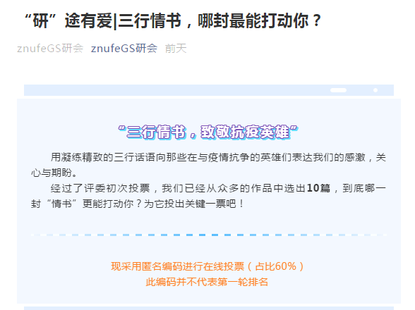(通讯员:刘婧)11月25-30日,为表达当代研究生对“抗疫英雄”的尊重与钦佩,公共管理学院、工商管理学院、刑事司法学院联合举办了“三行情书,致敬抗疫英雄”活动。此次活动旨在用凝练精致的三行话语向那些与疫情抗争的英雄们表达感激、关心与期盼。
