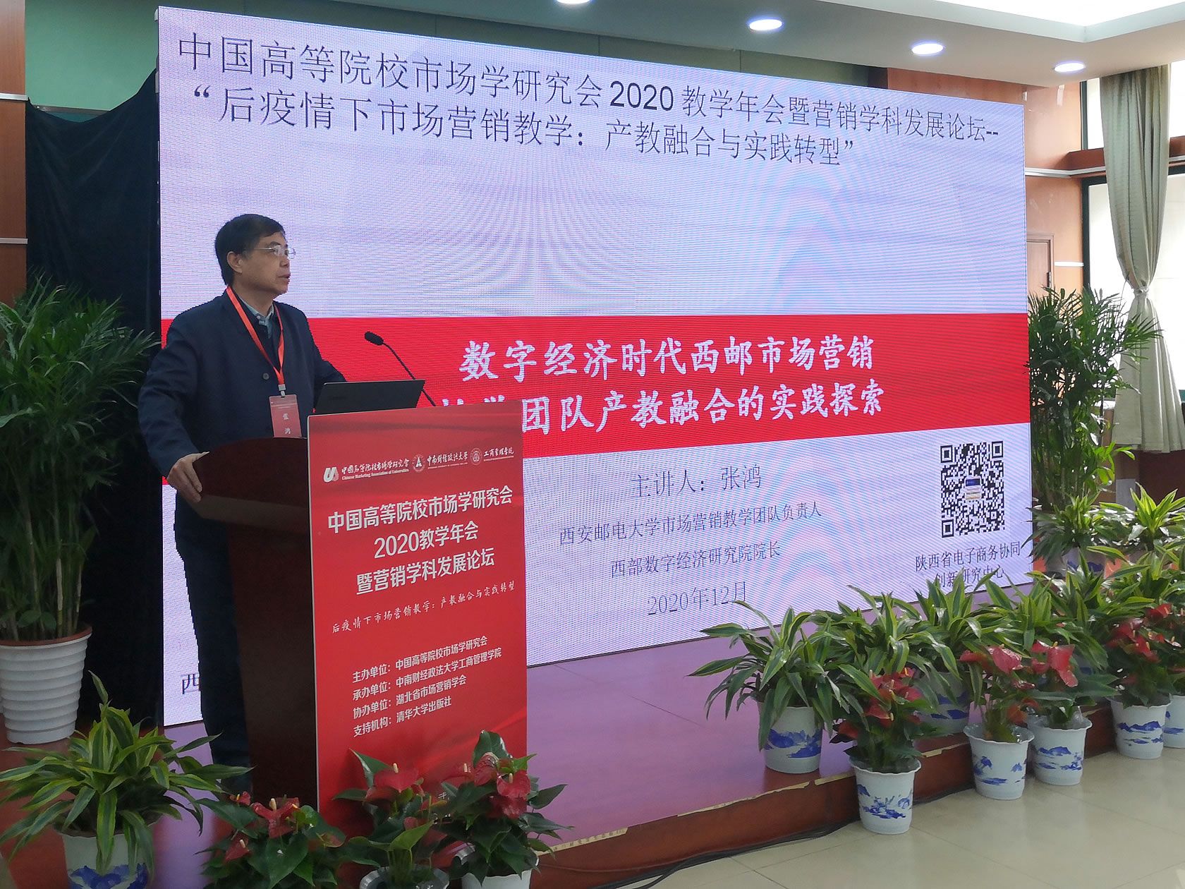陕西省经济学会会长、西部数字经济研究院院长、西安邮电大学张鸿教授以《数字化时代西邮市场营销教学团队产教融合的实践探索》为题进行演讲,他从教学团队的总体情况、营销学科教学的问题导向、解决方案、具体做法、成功经验、社会影响、新营销的思考七个方面介绍了宏观环境下,产教融合的成功经验。张鸿教授提到在数字经济时代,新经济数字化、网络化、智能化的融合才是最终趋势。我们要立足数字经济,辅助地域发展。