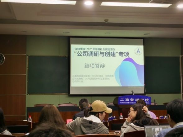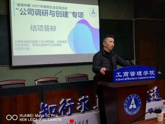 (通讯员:王若妍 洪子婷 韩豫凡 杨茜琳 郑瀚)4月1日晚上,我校社会实践一流课程《公司调研与创建》在文泉楼5楼会议室举行了“读懂中国”2021年寒假社会实践专项活动成果汇报会,参与汇报的有来自工商、会计、数统、金融、法学、公管、中韩等10个学院12支实践课程小组的56名同学,课程指导老师赵琛徽教授和港股上市公司龙光地产南宁公司人力资源总经理涂婷婷博士、黄石金梦创业服务有限公司周登江总经理一起作为评委对各组的汇报进行了指导和点评。