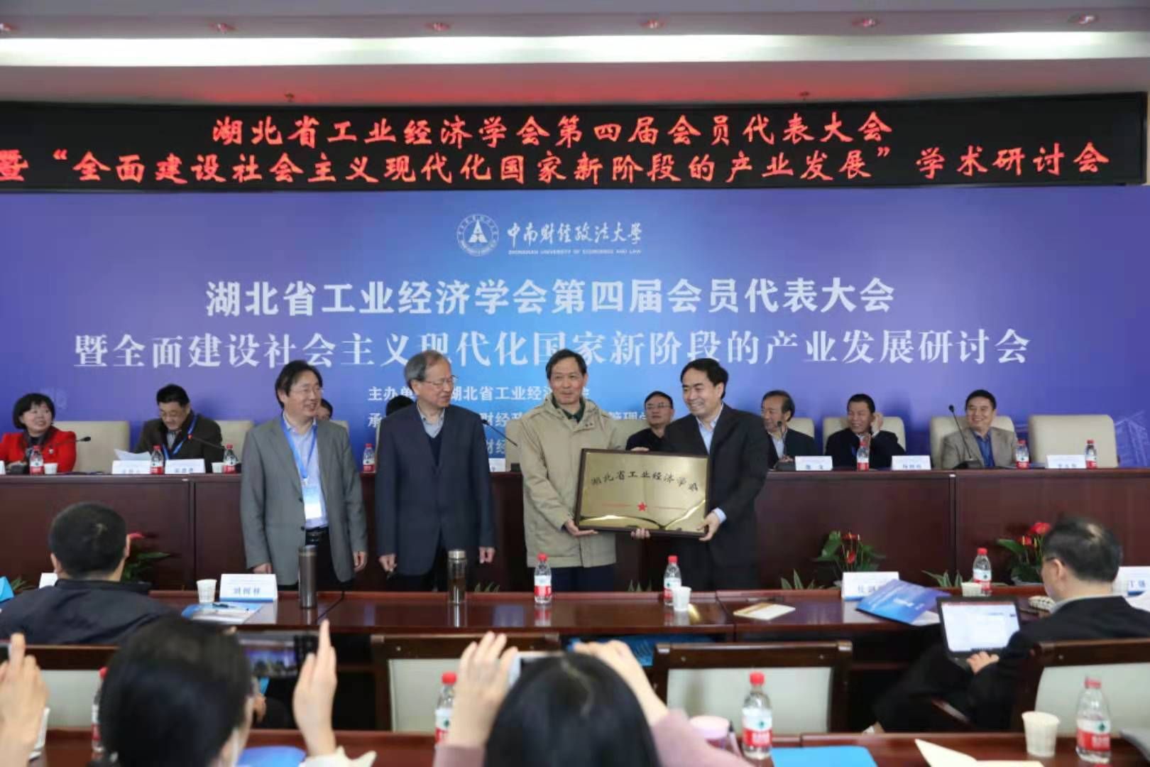 会议的最后,大会举行了湖北省工业经济学会牌匾移交仪式。金色的牌匾从上任秘书长杨艳琳手中转交到上任会长简新华手中,然后传递到新任会长胡立君手中,最后传递到新任秘书长石军伟手中。这一仪式代表着湖北省工业经济学会在发展壮大的道路上又进一步。牌匾移交仪式在热烈的掌声中完成。