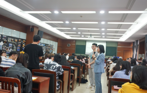 刘凤老师首先通过问题导入的方式,引导同学们去更好地认识自己。为调节活动现场氛围,刘老师以破冰活动为切入点,动员大家站起来,并且两两分组。首先由第一个同学对另一个同学说:“认识我是你的荣幸,因为我身上有100个优点,由于时间有限,我只说三个”。接下来另一个同学如法炮制。破冰活动瞬间使现场的气氛热闹了起来。刘老师也随机跟几位同学展开了互动,活动现场笑声不断。